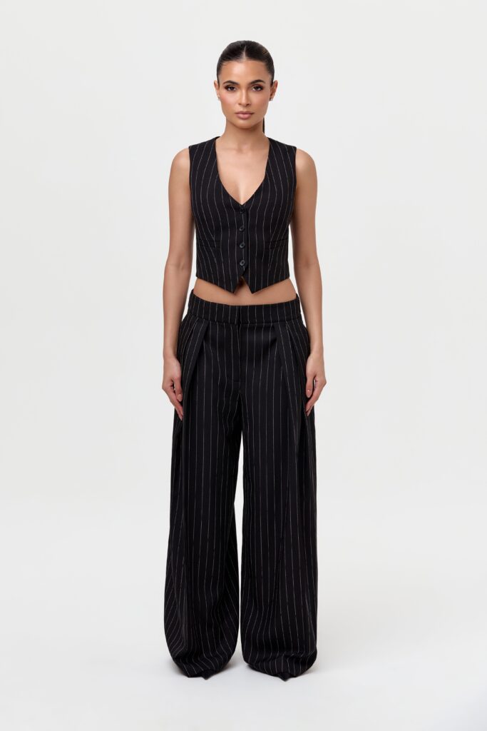 Compliment your power suiting collection with our pinstripe wide-leg pant. Designed with an adjustable waist for your waist preference, pocket…