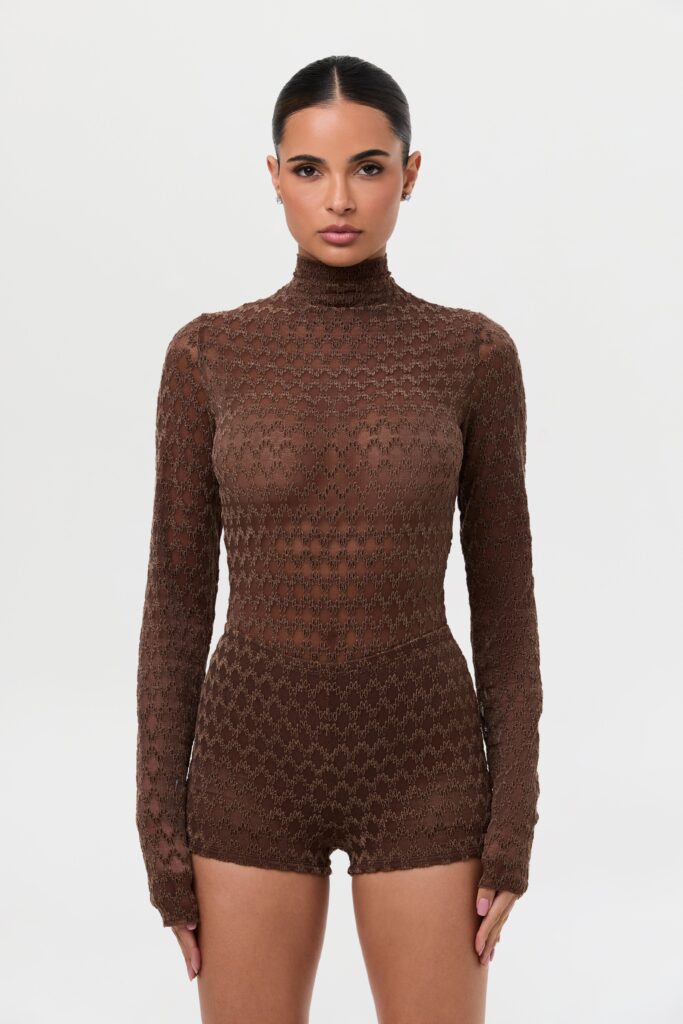 Our chocolate toned bodysuit is crafted with a luxurious flocked velvet in chevron print on a bed of sheer stretch…