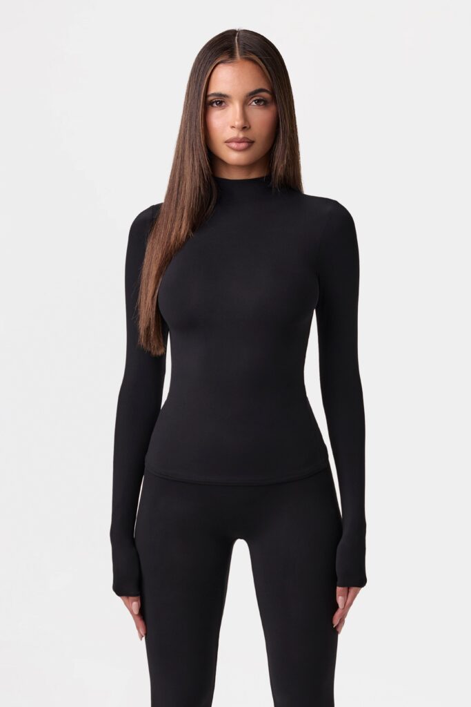 Basics with an edge. Our bold fabrication is designed in a sexy print, mock neckline, long fitted sleeves and a…